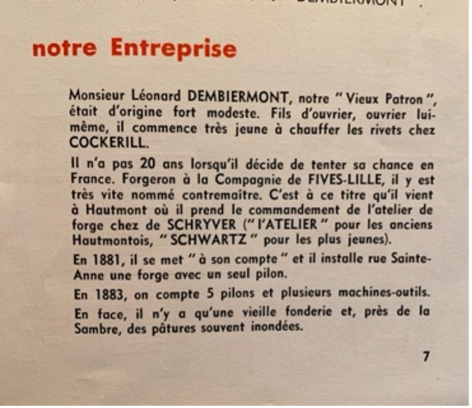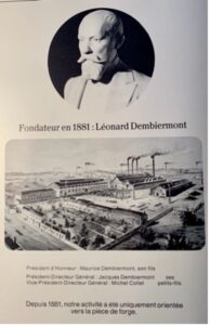 « À l’issue de la fête de Saint-Éloi, un buste de Léonard Dembiermont (1840 – 1913) a été dévoilé. Il se tient aujourd’hui à l’entrée de l’entreprise, sous un marronnier centenaire. Signe que l’usine a traversé les âges contre vents et marées. »